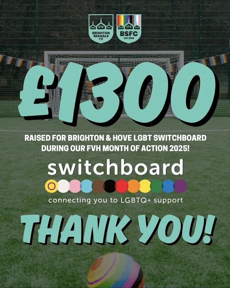 Brighton Seagals FC: An inclusive football club for women, non-binary and trans people in Brighton & Hove. Brighton Seagals FC: An inclusive football club for women, non-binary and trans people in Brighton & Hove. Discover Social Football Brighton Seagals FC: An inclusive football club for women, non-binary and trans people in Brighton & Hove. Brighton Seagals FC: An inclusive football club for women, non-binary and trans people in Brighton & Hove. Discover League Football The social media scoop… News from the nest… Brighton Seagals 8/15/25 Brighton Seagals 8/15/25 Seagals raise £1300 for LGBTQ+ Switchboard Read More Brighton Seagals 10/10/24 Brighton Seagals 10/10/24 Three volunteers complete Mental Health First Aid training! Read More Brighton Seagals 1/26/24 Brighton Seagals 1/26/24 Seagals shortlisted for two FvH 2024 awards! Read More Brighton Seagals 1/15/24 Brighton Seagals 1/15/24 Club award: Equality Charter Level 2 Read More Brighton Seagals 11/7/23 Brighton Seagals 11/7/23 Kitlocker.com become a club partner Read More Brighton Seagals 10/14/23 Brighton Seagals 10/14/23 BHAFC invite the Seagals to training! Read More Brighton Seagals 8/31/23 Brighton Seagals 8/31/23 Welcome, Coach Sian! Read More Brighton Seagals 7/12/23 Brighton Seagals 7/12/23 Welcome, Coach Harvo! Read More Brighton Seagals 6/25/23 Brighton Seagals 6/25/23 Club award: Equality Charter Level 1 Read More Brighton Seagals 6/15/23 Brighton Seagals 6/15/23 Karen Dare departs the club. Read More Brighton Seagals 6/3/23 Brighton Seagals 6/3/23 2023 AGM Agenda Read More Brighton Seagals 3/31/23 Brighton Seagals 3/31/23 31st March: Trans Day of Visibility Read More Older Posts